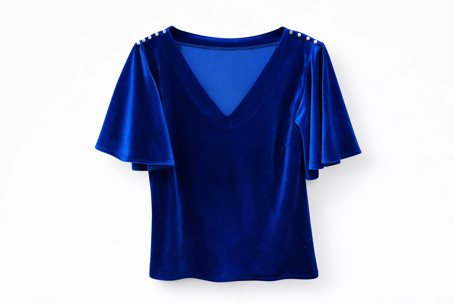 Bluză de damă realizată din catifea, într-o nuanță intensă de albastru royal. Designul este completat de detalii delicate tip perle aplicate pe umeri, care adaugă un accent rafinat și feminin.