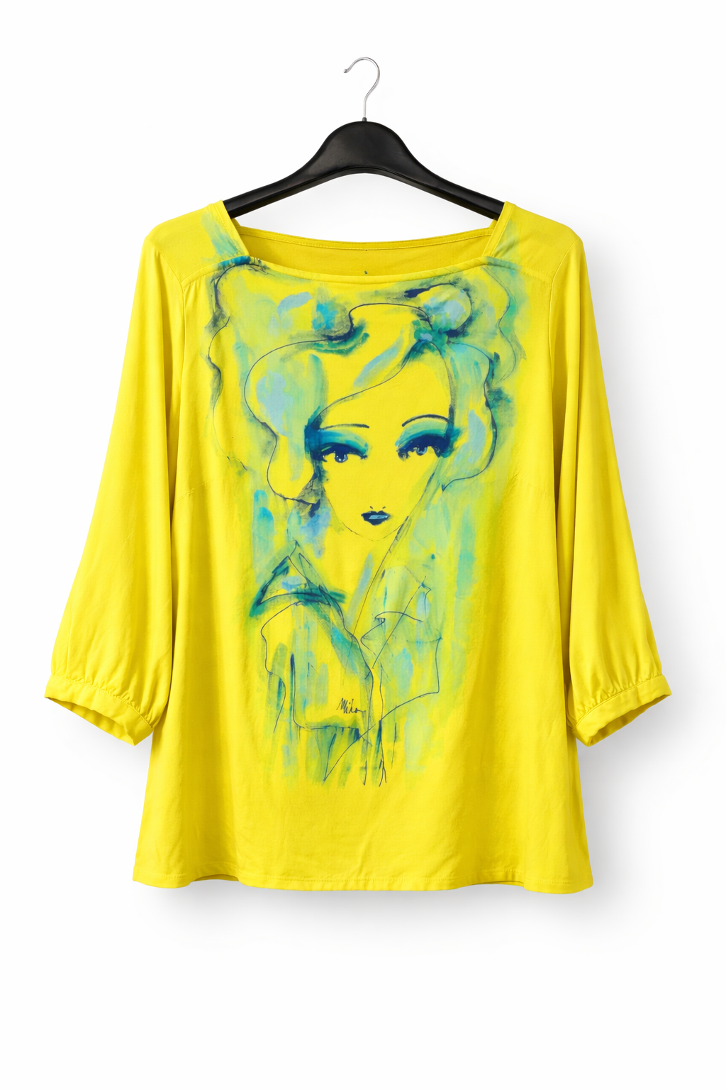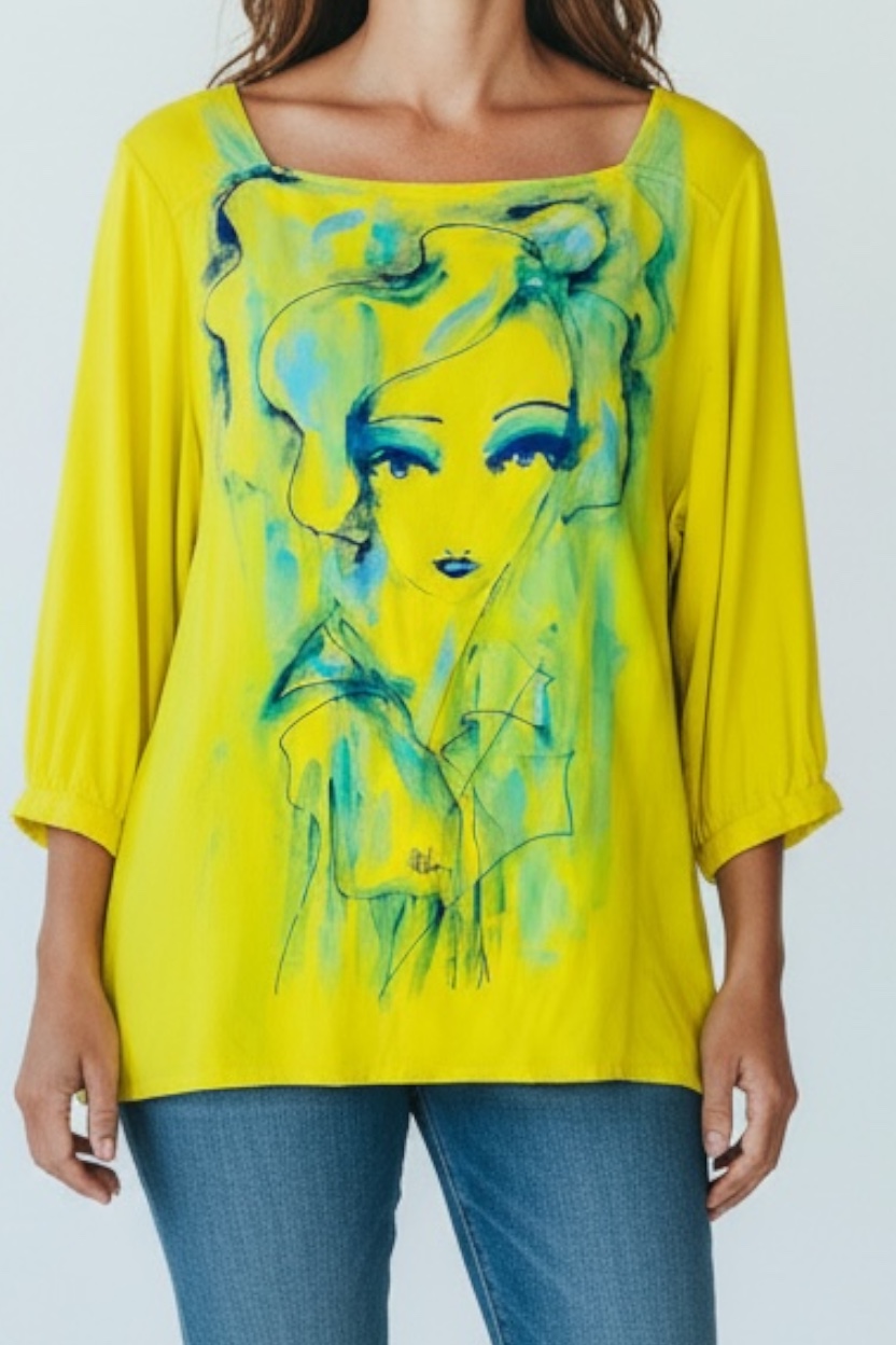 Bluză de damă cu design vibrant, realizată din material fluid și decorată prin pictură manuală. Ilustrația artistică stilizată oferă unicitate fiecărei piese, transformând bluza într-un element central al ținutei.