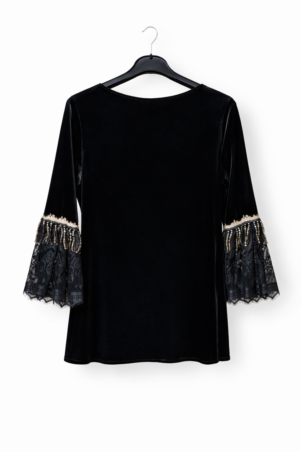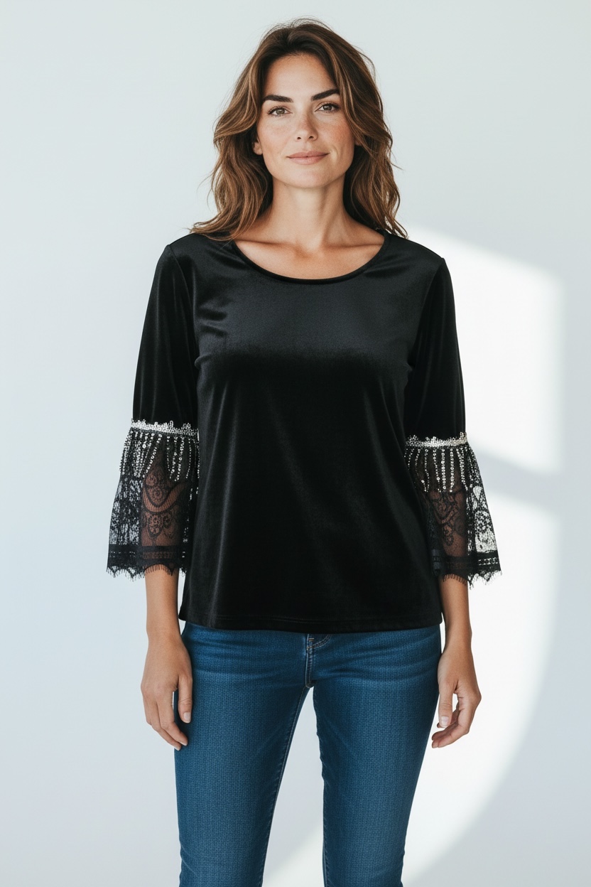 Bluza neagra din catifea cu maneci din dantela si aplicatii