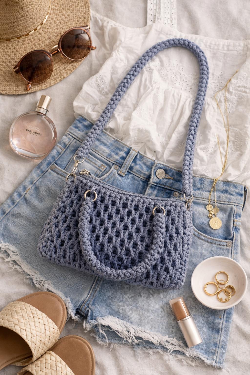 Geantă realizată manual, cu design croșetat și aspect delicat, într-o nuanță de bleu deschis, ușor de integrat în ținute feminine și luminoase. Modelul este echilibrat, cu textură plăcută și formă practică, ideală pentru purtare zilnică sau ocazii relaxate.
