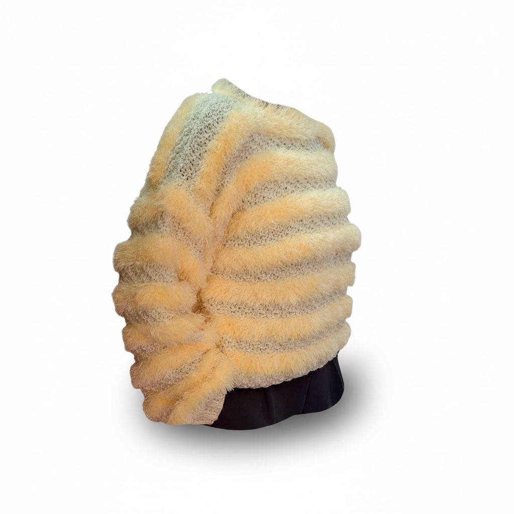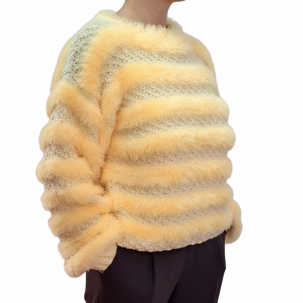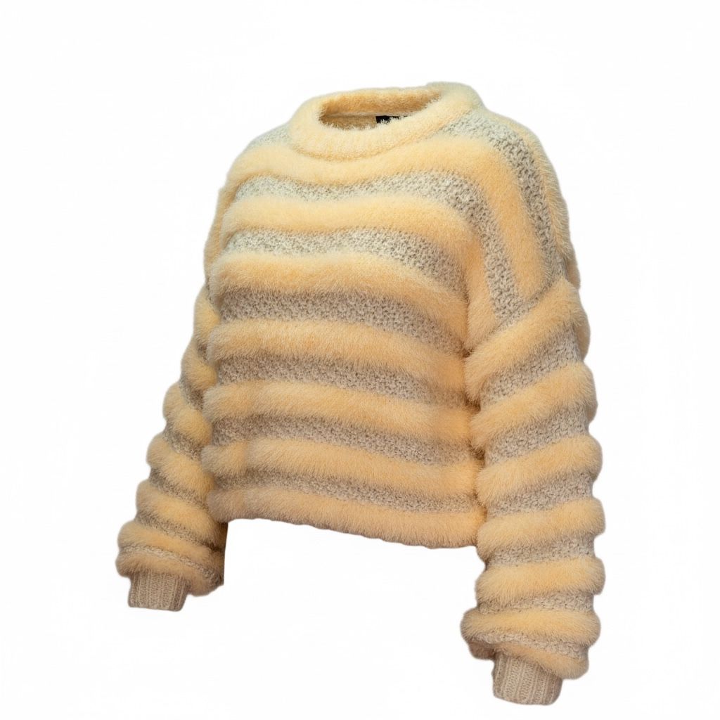 Un pulover care îți dă instant senzația de confort și căldură. Realizat dintr-un mix de fire, cu zone pufoase și zone tricotate clasic, modelul creează un joc subtil de texturi și dungi în nuanțe calde. Croiala lejeră și ușor scurtă îl face ușor de integrat în ținute moderne, iar textura moale îl transformă într-o piesă pe care o vei purta din plăcere, nu doar din nevoie.
